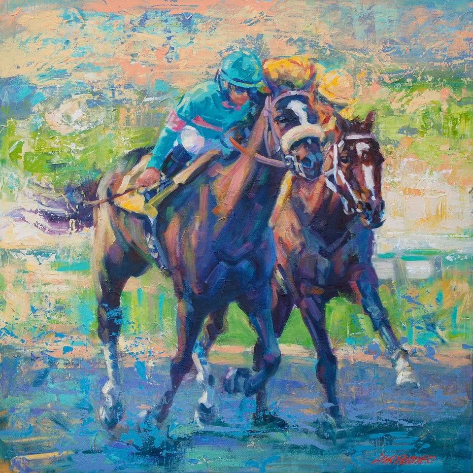 Palombo’s lifelong connection to horses, combined with her mastery of composition and color, allows her to infuse each painting with a sense of spirit and story. Her brushwork is loose yet deliberate, often allowing the viewer to feel the rhythm and tension of a race frozen in time. Her work speaks not only to racing fans but to anyone who understands the power and beauty of these animals.