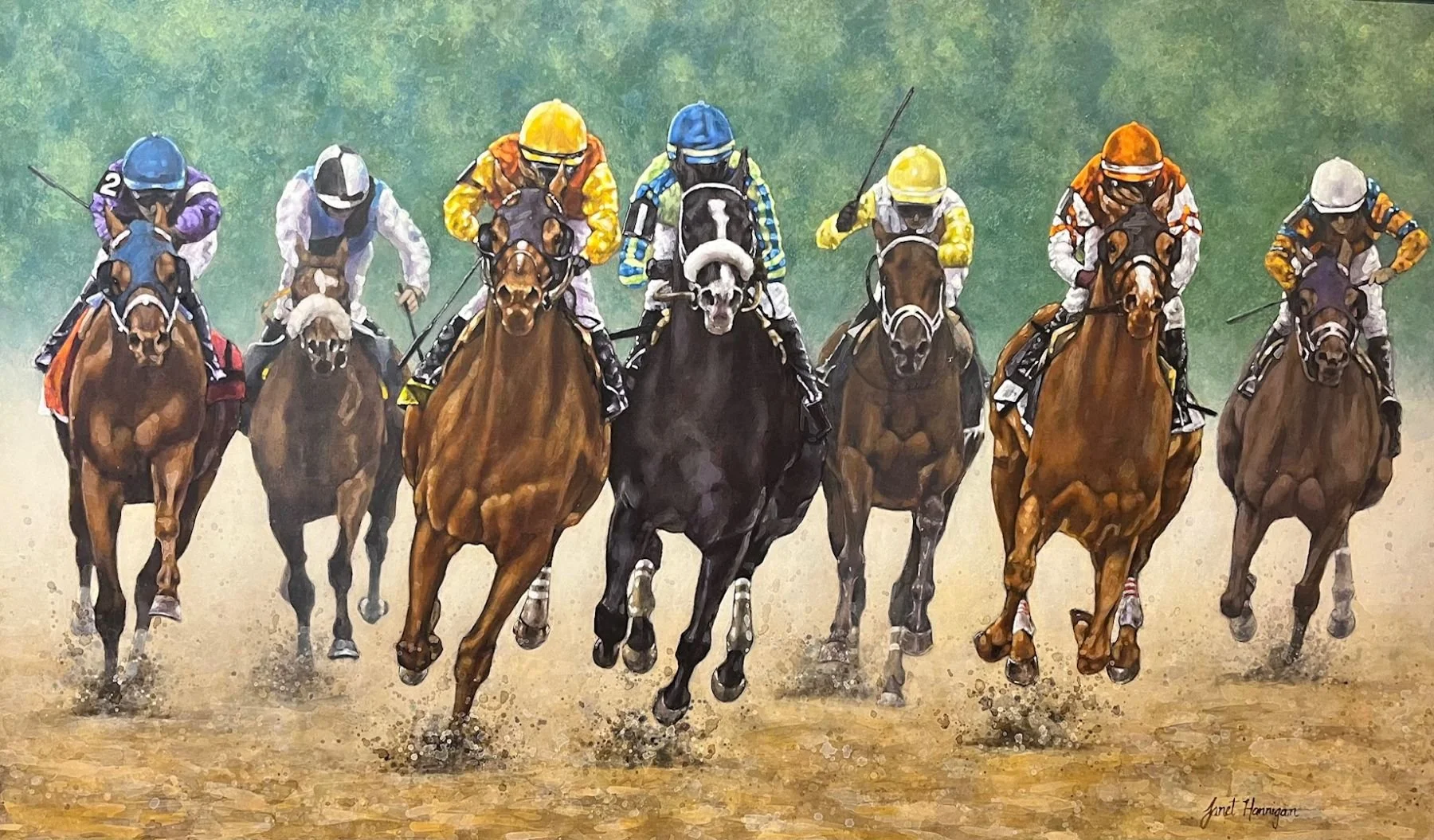 Janet Hannigan is a classically trained fine artist who received her BFA from Parsons School of Design in New York City. Janet’s unique painting style reflects a technique she learned while at Parson’s of layering acrylic washes to create depth and detail. This is the perfect medium for capturing the power, intensity and beauty of horse racing.