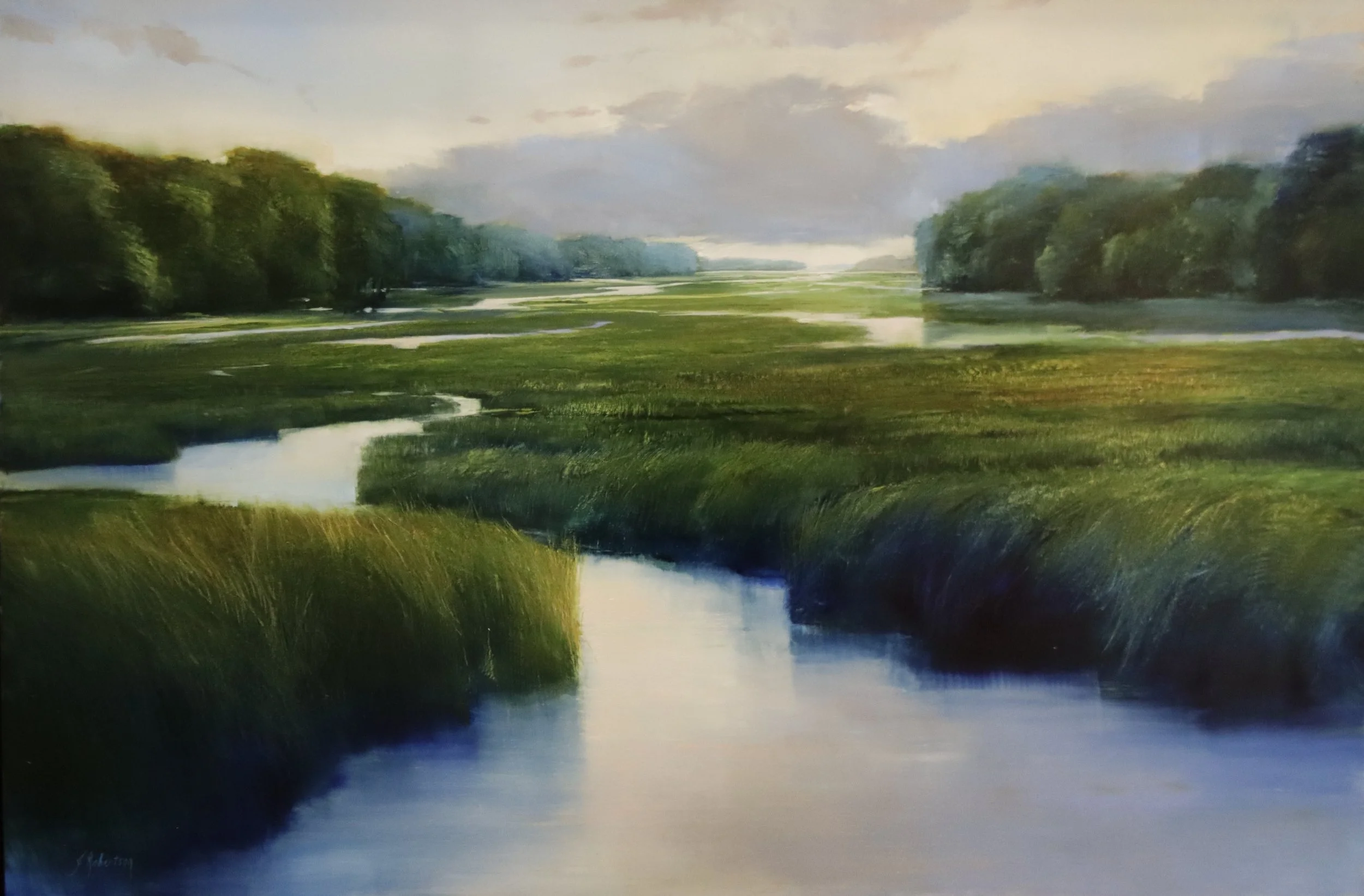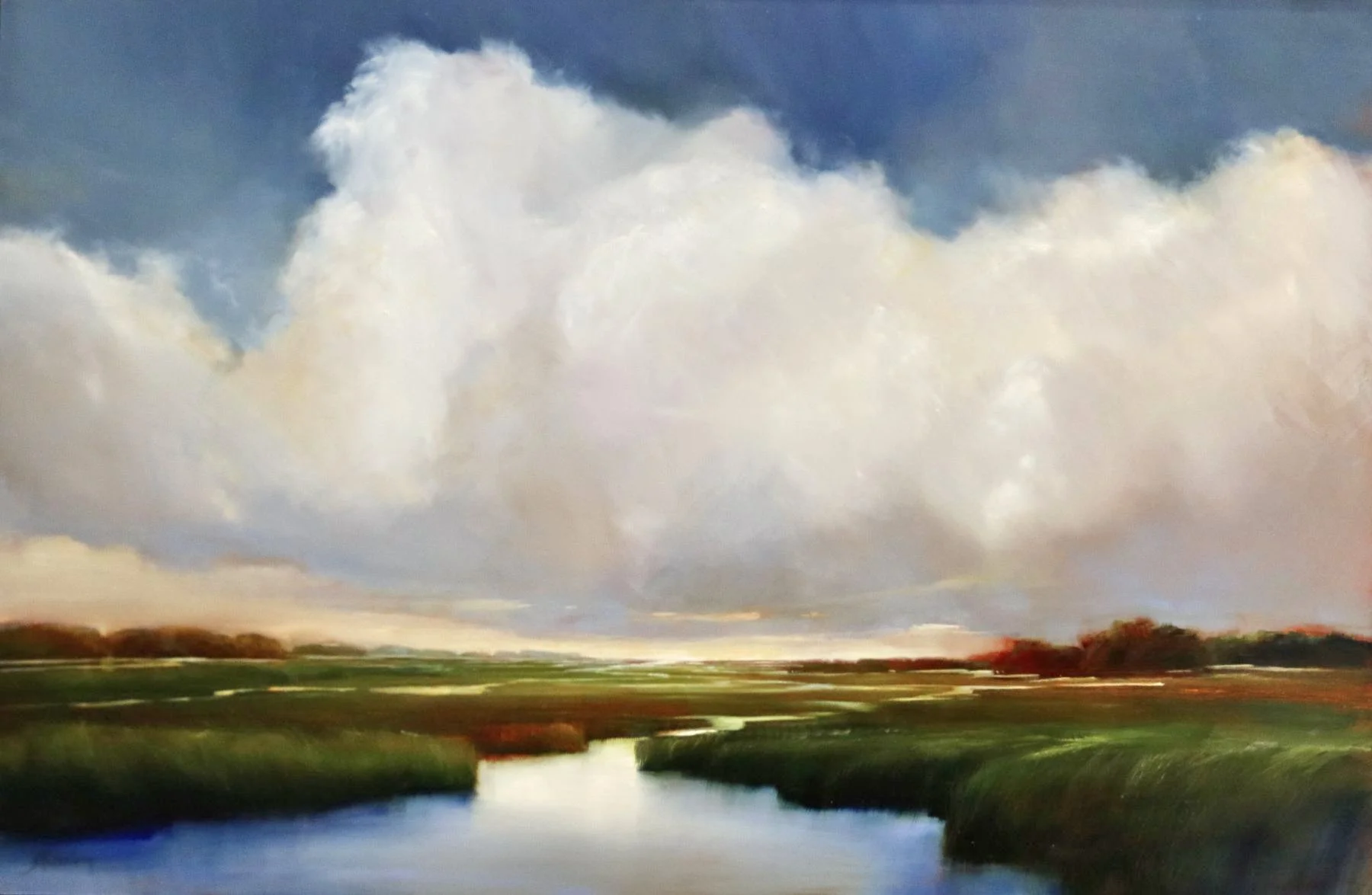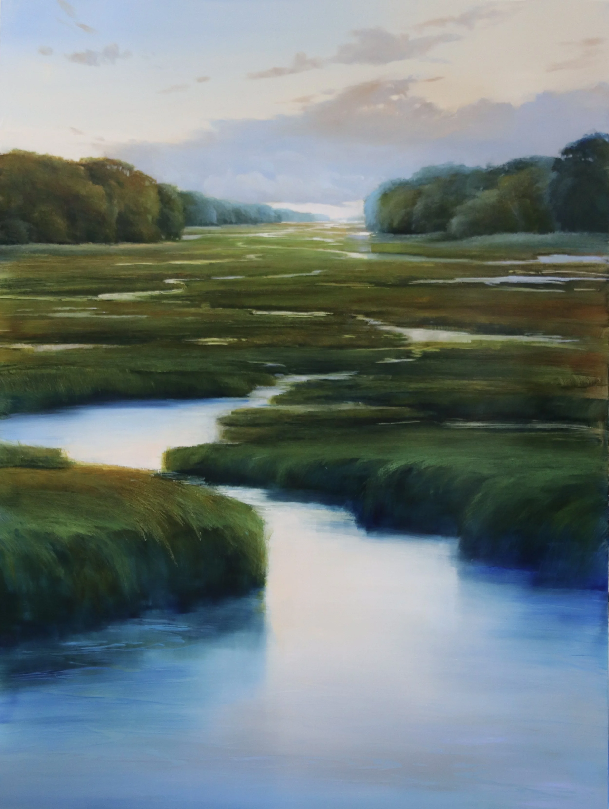 Most of the inspiration for Janine’s work comes from the marshes and shorelines of the Northeast, particularly those along the New England coast. Janine often begins her painting en plein air and then completes them in her studio in order to ensure a strong composition and more effectively explore the effect of light and time on the landscape. Some of Janine’s work is also created through imagination using fragments of photos and memories to create a compelling composition.