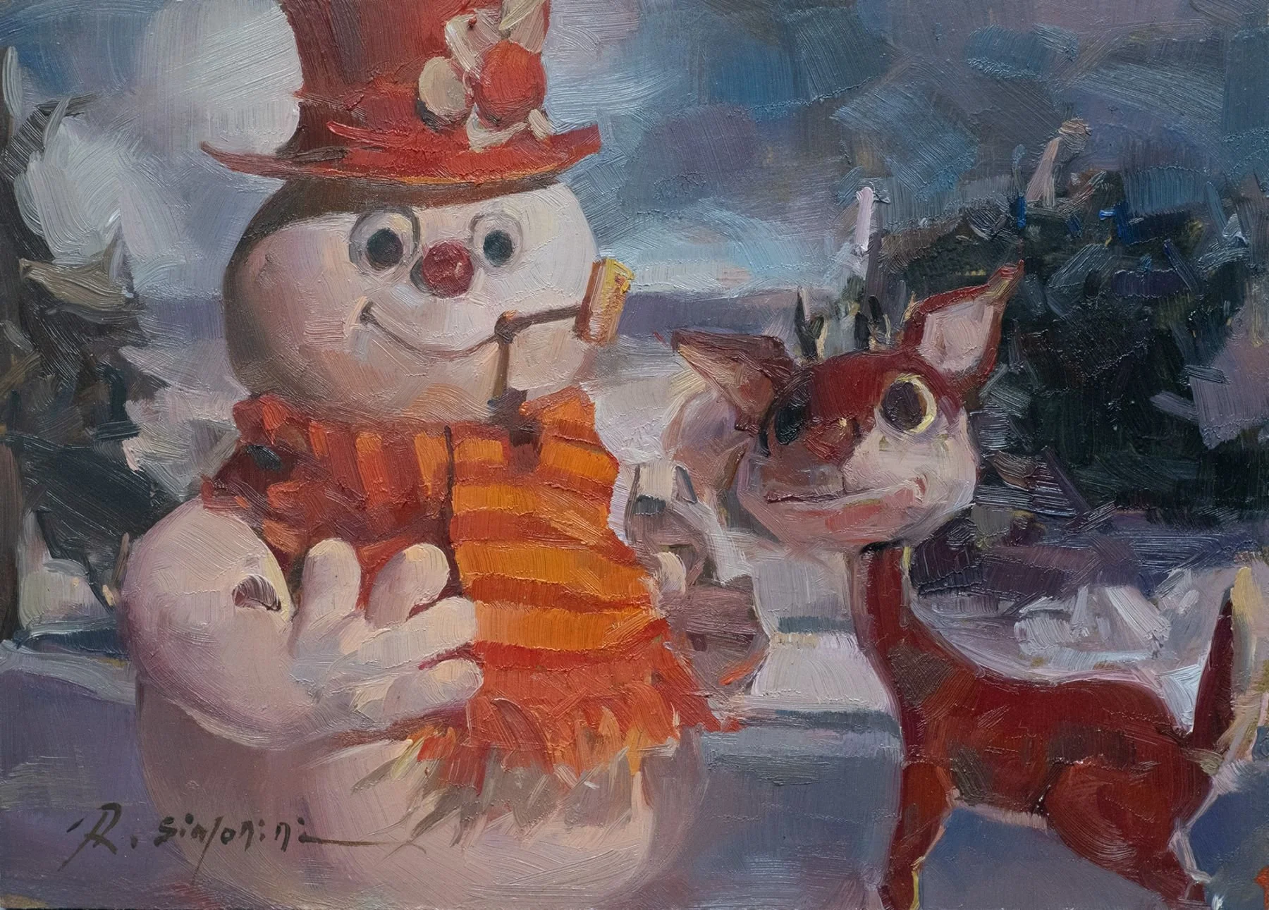 Since moving to the United States and residing in rural Vermont, Simonini found inspiration in the landscape and animals around him.  He enjoys painting these subjects, giving each animal a personality of its own.